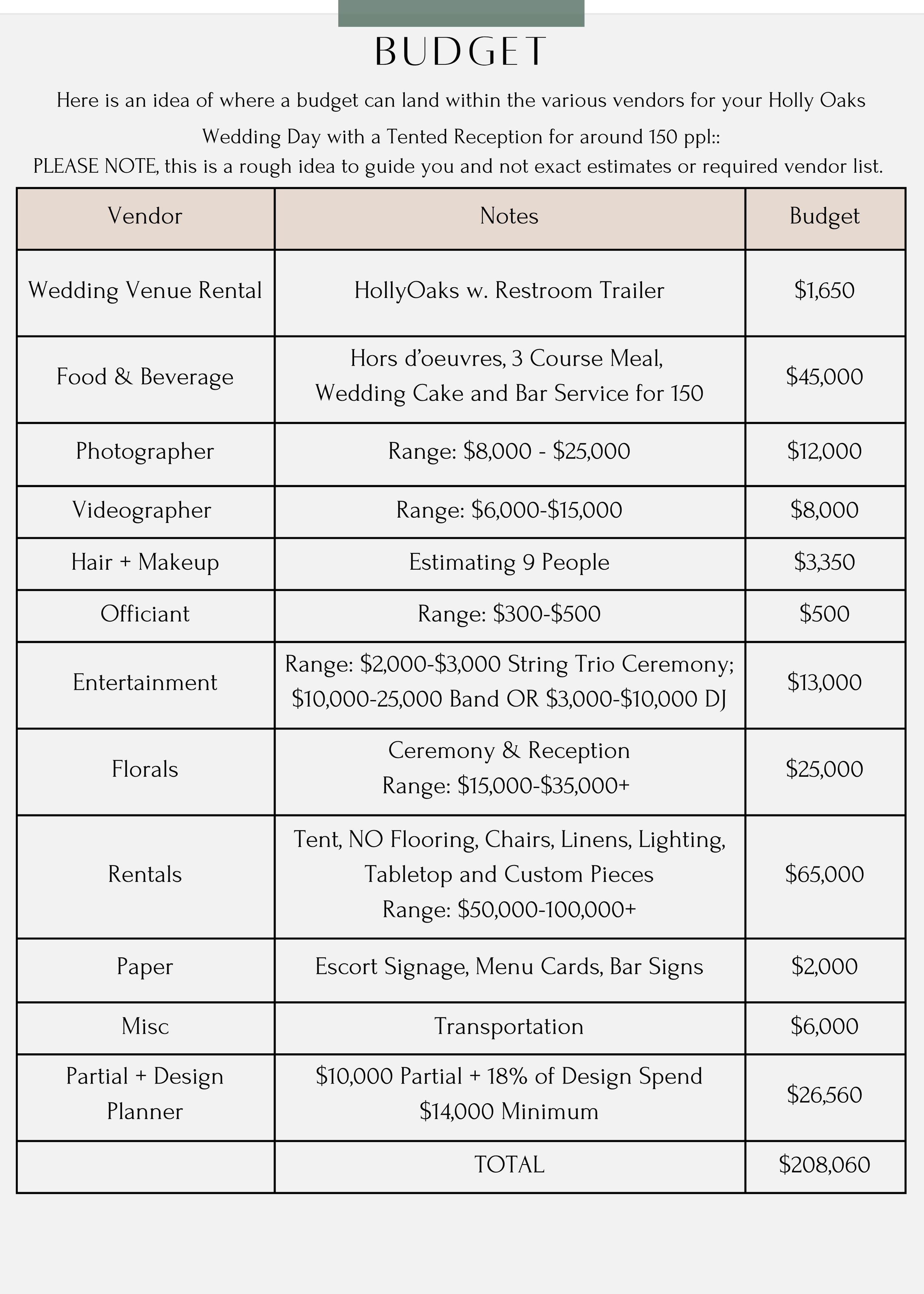 Managed Budget & Vendor Payment Tracker: Receive a tailored budget outline aligned with your wedding vision. We'll consistently update and oversee all vendor payments, ensuring the financial aspects of planning are transparent and clear from Day 1.